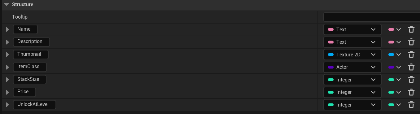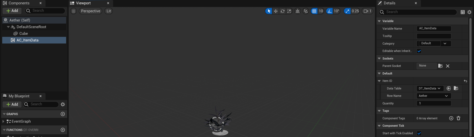 Thanks to this Data Table, to add a new object to the world is fairly easy as you will just need to add it here and then create an actor, add to it the “Ac_Item Data” Component in the viewport and assign to it the right object from the Data Table. once this is done the name of the object will appear when the player looks at it in the bottom of the screen and when picked up the right thumbnail will appear in the Inventory. I also use a Structure to keep track of the information I want to acquire about specific Items in other Blueprints.