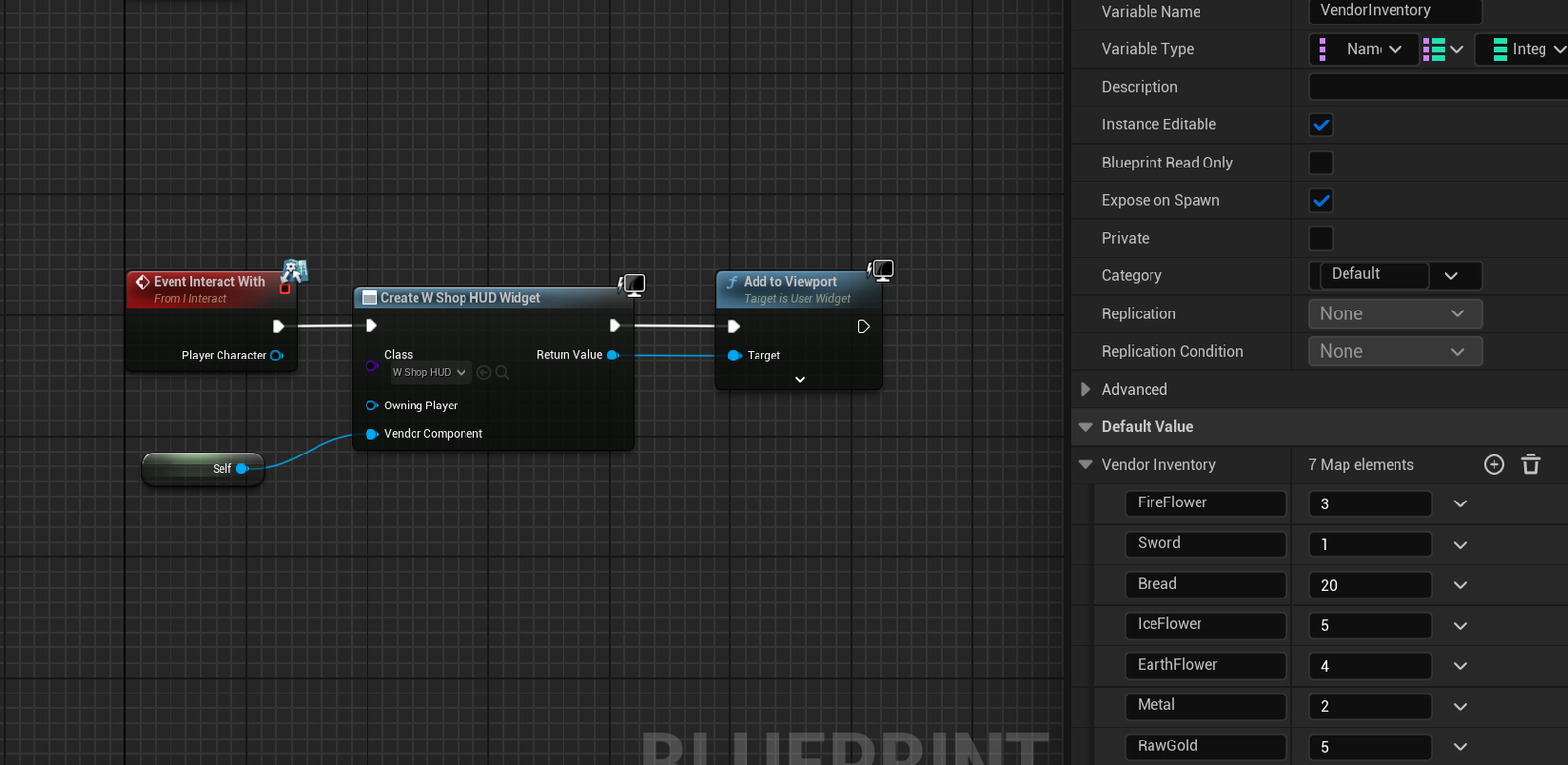 After planning the System in Machinations, I went into Unreal Engine to replicate it in Blueprints. I used a Map of Names, that have to be the same as the Row Names in the Data Table containing all the objects, so that a reference is created and all the information are the same, and Integers for the amount that the Merchant has. This makes for a very scalable System where, to add a new element to the Merchant Inventory, you just need to add a new element to the Map with the same Row Name found in the Data Table and the quantity that the Merchant owns (in the video min. 1.25 you’ll find a demonstration of this).
