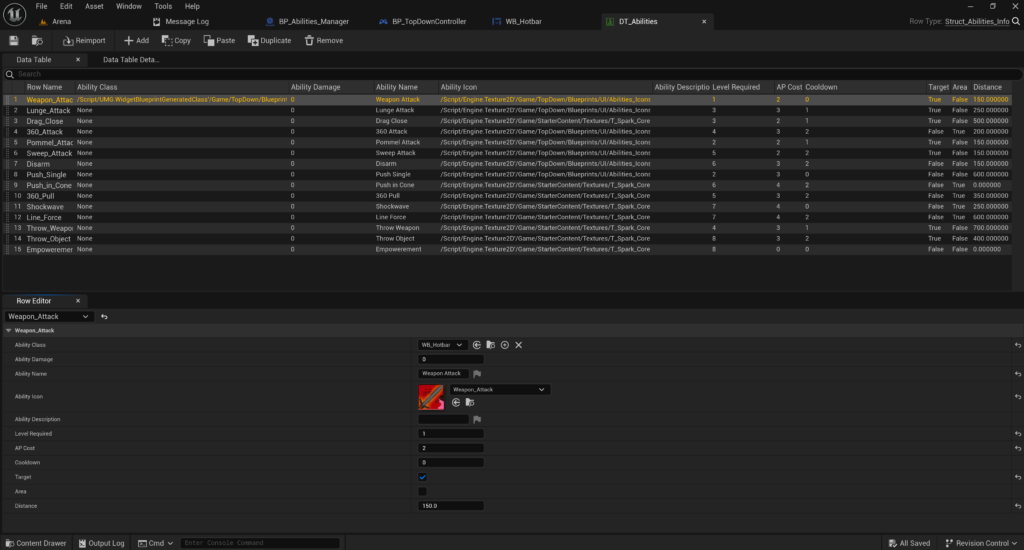 I used a data table to store all abilities and their information (AP cost, cooldown, range); I then created an ability manager, which is a single blueprint where all ability effects are gathered as functions. To create a new ability, a new function for it must be created in this blueprint. Then, the ability is added to the corresponding Enumerator (Warrior or Telekinetic) and added to the OnClick function in the player controller. Once this is done, it will only need a button in the Hotbar Widget Blueprint that activates the ability when pressed.